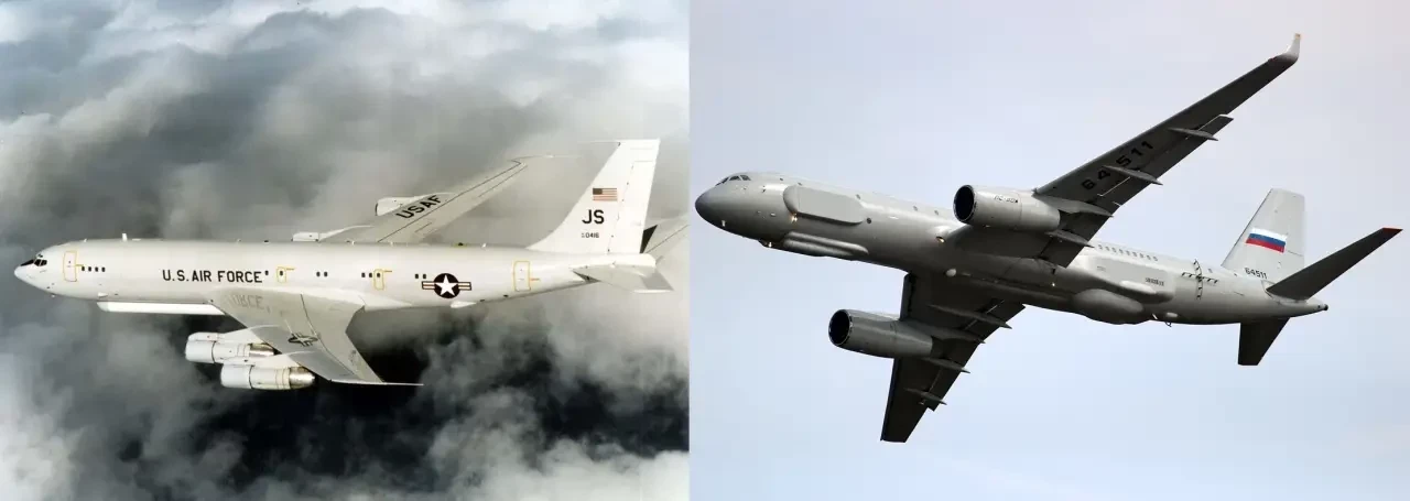 Самолёты РБУиЦ E-8C JSTARS (слева) и Ту-214Р (справа)