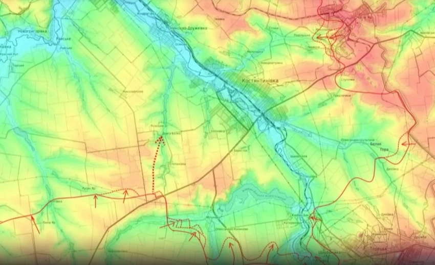 "Также мы развернули наступление, которое уже можно отобразить на картах в районе Русино-Яра. Здесь восточнее Русино-Яра мы тоже заняли несколько важных лесопосадок. И очевидно, что мы пытаемся развивать дальше наступление на Степановку и далее Долгую Балку, чтобы таким образом обрезать коммуникации противника на Константиновку с запада и соответственно взять всю эту группировку в клещи. Судя по тому, что я вижу, мы вероятнее всего здесь тоже не будем в лоб штурмовать Константиновку, а попытаемся охватить её и заставить противника её покинуть", - отметил Юрий Подоляка.
