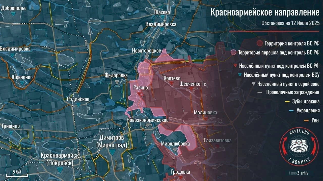 На Покровском направлении ВС РФ имеют тактические успехи в районе Новоторецкого, здесь идут ожесточённые бои и ВС РФ смогли продвинуться в южной и центральной частях упомянутого населённого пункта, ведут зачистку Фёдоровки и Бойковки. Под контроль российских войск перешел участок местности по рубежу Разино-Мирное.