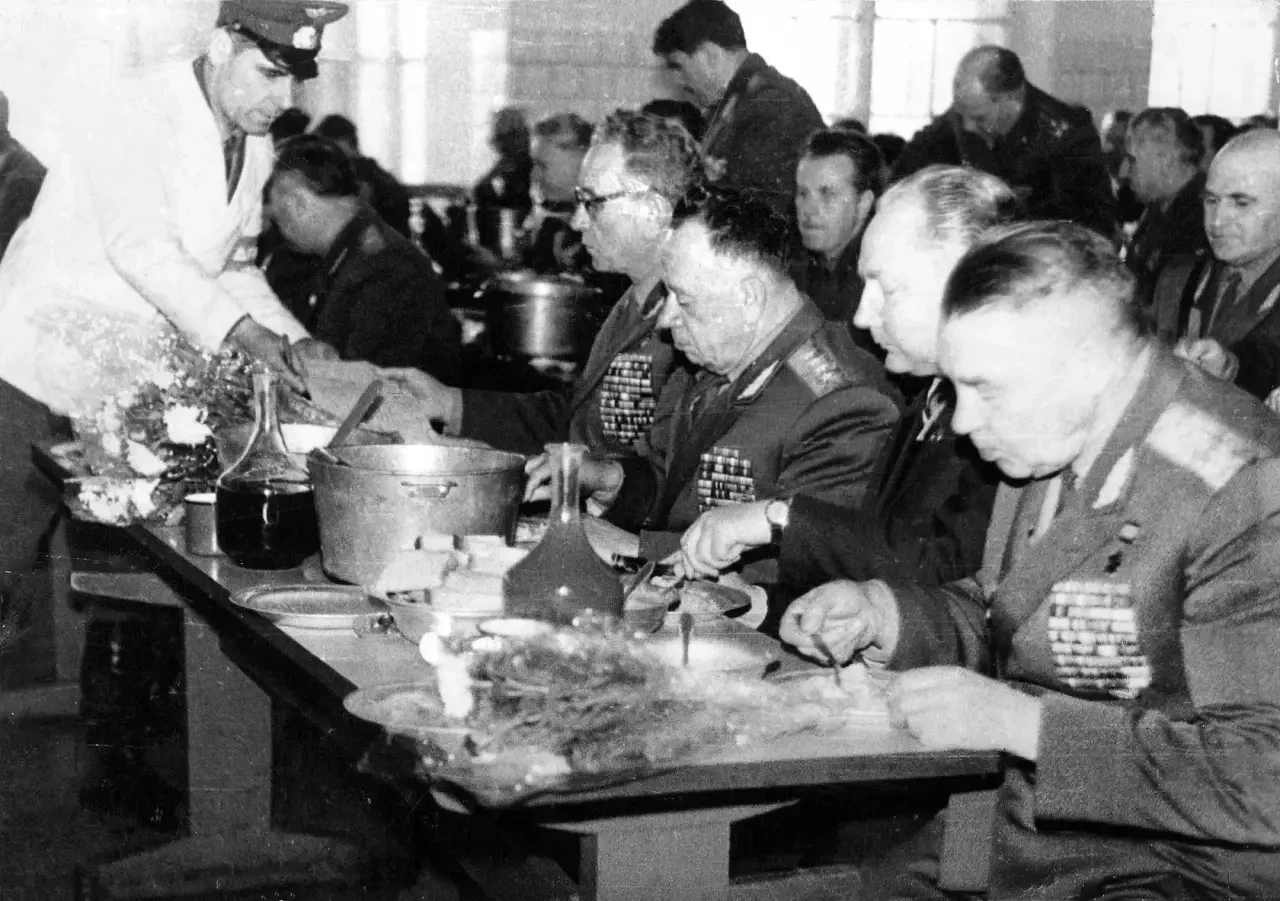Столовая была двухэтажной. На первом этаже малый зал, на втором — основной, обеды в котором устраивались даже для высшего командного состава Советской Армии: министра обороны СССР маршала Советского Союза Андрея Антоновича Гречко, начальника Главного политического управления Алексея Алексеевича Епишева и командующего ВДВ СССР Василия Филипповича Маргелова.