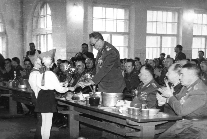Боровуха-1. Столовая 350-го гвардейского парашютно-десантного полка. Пионеры вручают цветы министру обороны СССР маршалу Андрею Антоновичу Гречко.
