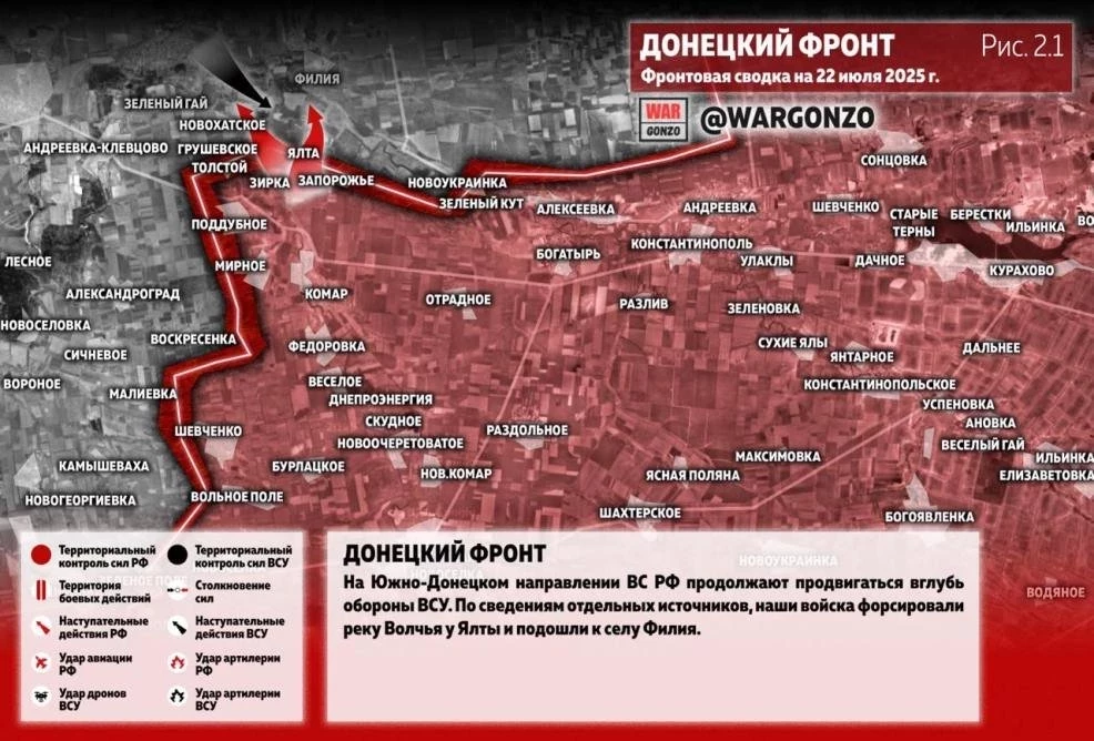 Карта боевых действий на Украине на 22.07.2025