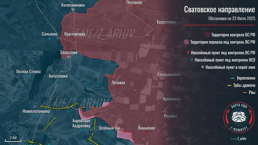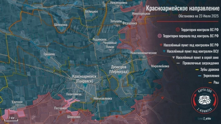 На Покровском направлении фиксируется продвижение между Орехово и Алексеевкой, идут бои за Котлино и в районе Леонтовичей, Удачного, Шевченко. Зверево в серой зоне.