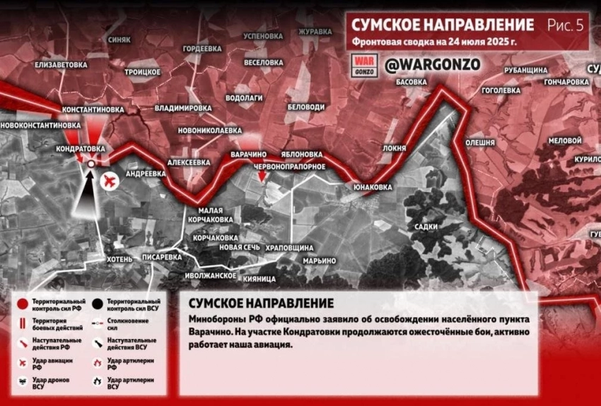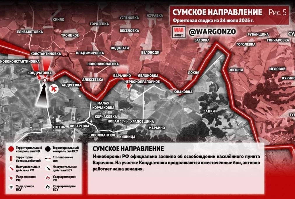 На Сумском направлении Минобороны РФ официально заявило об освобождении населённого пункта Варачино. На участке Кондратовки продолжаются ожесточённые бои, активно работает наша авиация.