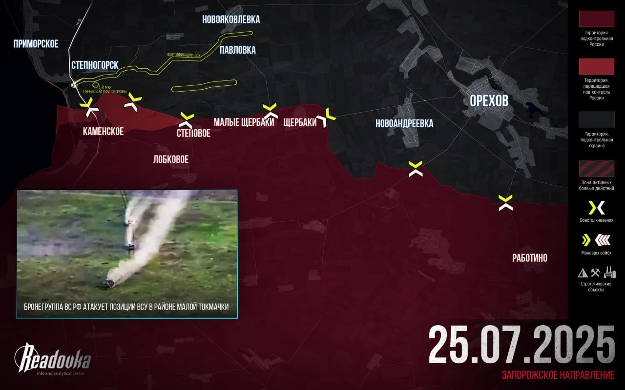 Запорожское направление: ВС РФ имеют тактические успехи в районе Мирного и Воскресенки, давят в направлении Малиевки. Российские войска расширили контроль территории в Каменском, ведут штурмовые действия на окраине Степногорска.