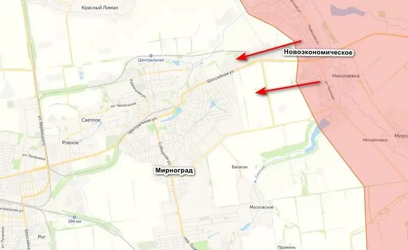 Медийный боевик с позывным «Мучной», воюющий на данном участке, написал в своем ТГ-канале, что ситуация на восточных окраинах Мирнограда критическая, российские войска начали заход на окраины, пока мелкими группами. Очень активно работает российская артиллерия, а также дроны. По мнению украинского боевика, на атаке с востока ВС РФ не остановятся, будут также предприниматься попытки зайти с юга, чтобы отрезать Мирноград от Покровска.