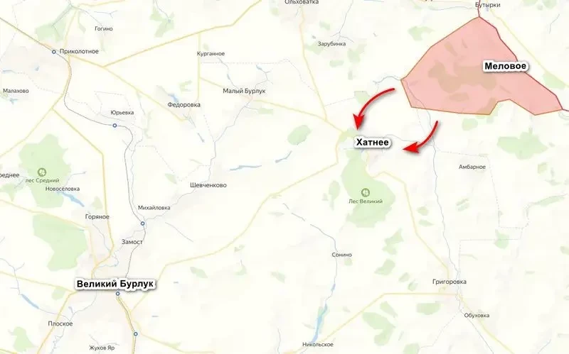 Накануне сообщалось, что подразделения ВС РФ, форсировав реку Верхняя Двуречная, закрепились на западном берегу, создав плацдарм. При этом наши наступают сразу в нескольких направлениях, сбивая заслоны противника и стремясь взять прилегающие населенные пункты. Хатнее важно тем, что из него идет хорошая трасса прямо на Великий Бурлук, который и является основной целью наступления на данном направлении. От села Хатнее до Великого Бурлука не больше 15 км.