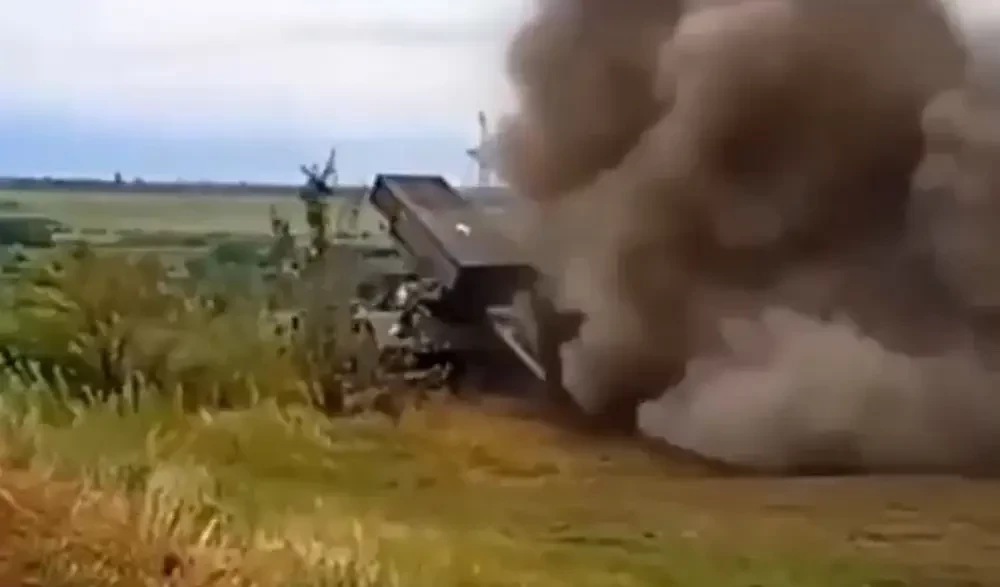 Судя по всему, устаревший боеприпас не только не сумел вылететь из направляющей шахты, но и взорвался. На это указывает характерный столб пыли на месте его падения. Тогда ВСУ с успехом избавились от еще одного образца ненавистного им советского наследия в виде РСЗО. Ну или сильно ее повредили.