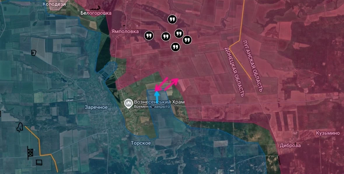 На карте видно постепенное сближение с Красным Лиманом, где российские войска используют рельеф для манёвров.