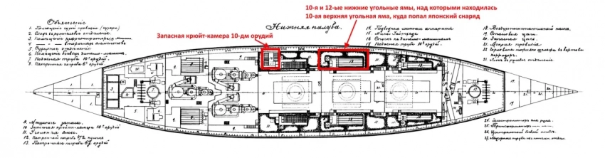 «Вскоре после первого снаряда, второй попал в десятую угольную яму, пробив броню. По показанию команды, от удара этого снаряда отвалился целый лист брони. Вода показалась в левой запасной крюйт-камере 10-дм орудий, и крен стал сильно увеличиваться».