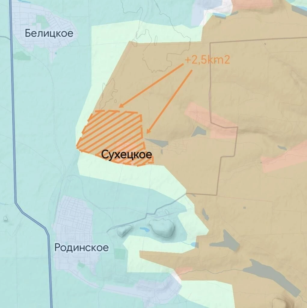 Восточнее Мирнограда сообщают о завершённой зачистке ГОКа, расположенного неподалёку от города. Севернее идут бои на окраинах Красного Лимана и Родинского. Часть территории севернее Сухецкого в серой зоне.