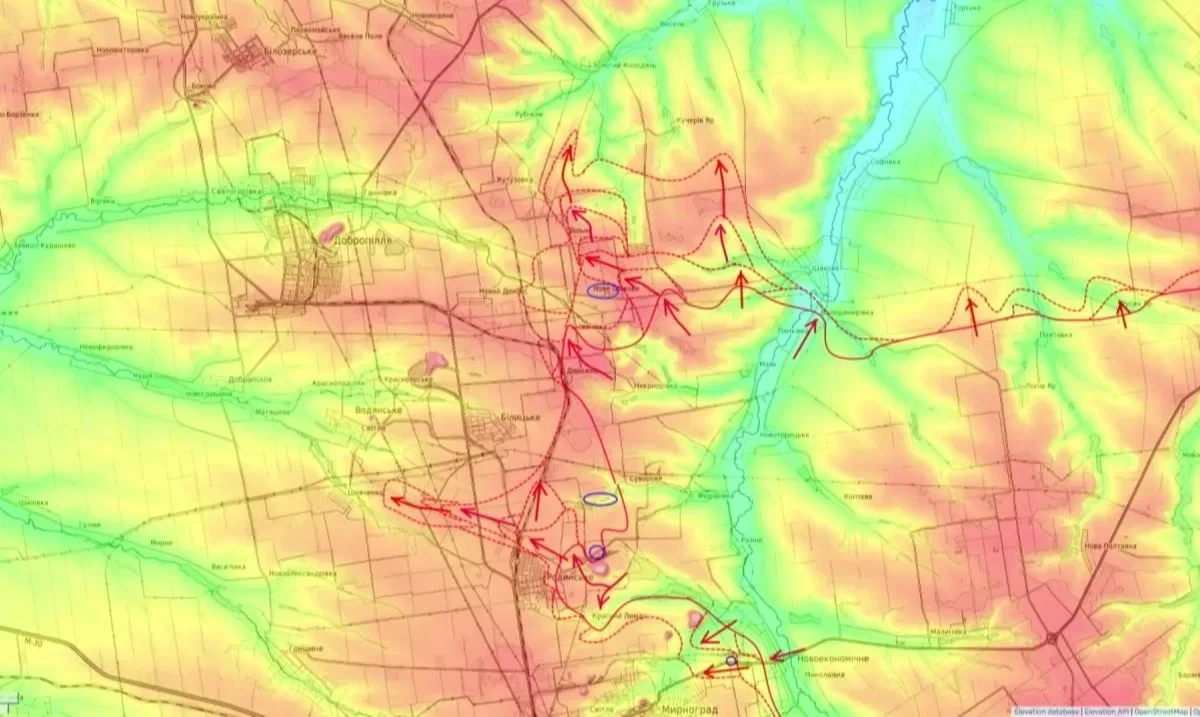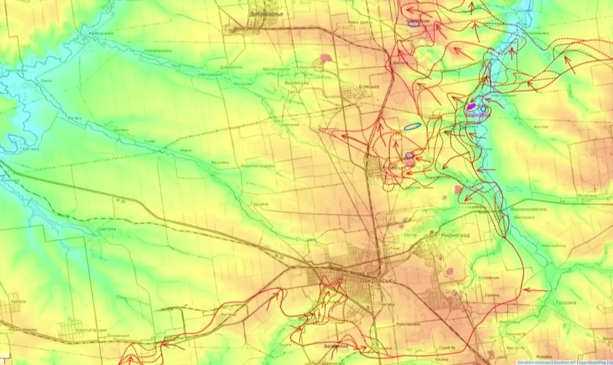 Наиболее интенсивные бои разворачиваются в районе Покровска, где обе стороны сосредоточили основные силы. Ситуация в городе крайне сложная: ни российские войска, ни ВСУ не контролируют Покровск полностью. Город превратился в «слоёный пирог», где штурмовые группы обеих сторон занимают отдельные районы, ведя ожесточённые бои за контроль над ключевыми позициями.