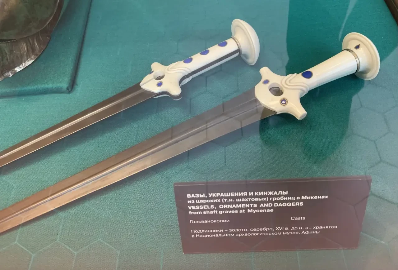 Прекрасно изготовленные копии бронзовых кинжалов из Микен, XVI в. до н.э. Подлинники – в Национальном археологическом музее в Афинах