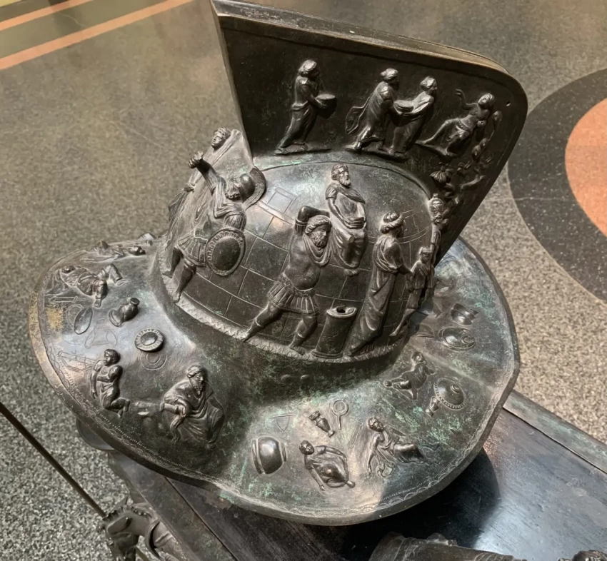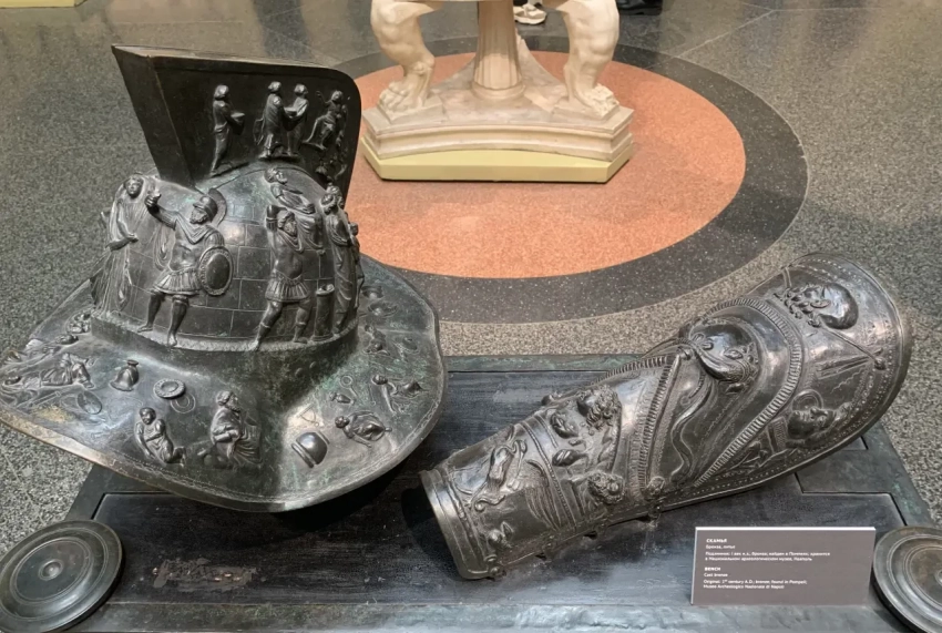 Здесь же можно увидеть и вот такие прекрасные вещи: шлем и поножу гладиатора. Бронза, литье. Подлинники I века н.э.; найдены в Помпеях; аналоги хранятся в Национальном археологическом музее Неаполя