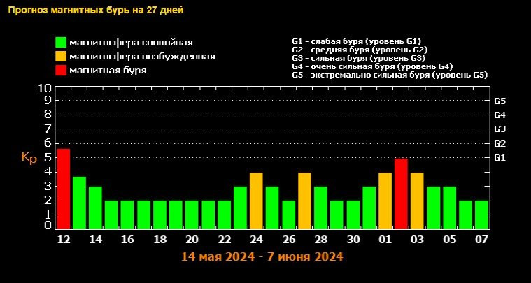 Чтобы самим не загадывать наперед, можно взглянуть на прогноз по бурям на следующие 27 дней. Специалисты Лаборатории прогнозируют, что слабая магнитная буря поджидает жителей Земли 2 июня. Перед этим несколько раз магнитосфера нашей планеты будет колебаться. Предварительно, 24 мая, 27 мая и 1 июня, а после еще 3 июня.