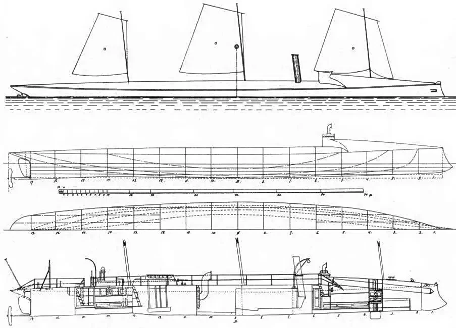 Некоторые особенности корабельной архитектуры заставляют ряд исследователей думать, что под миноносец завод пустил корпус строящейся либо уже построенной яхты «Маб»: уж больно необычными для боевого корабля были обводы и вооружение миноносца. Одна медная обшивка чего стоит! Миноносец спустили на воду 13 августа 1877 года, в строй ввели к концу года. В целом, первый блин, полностью оправдав пословицу, вышел комом.