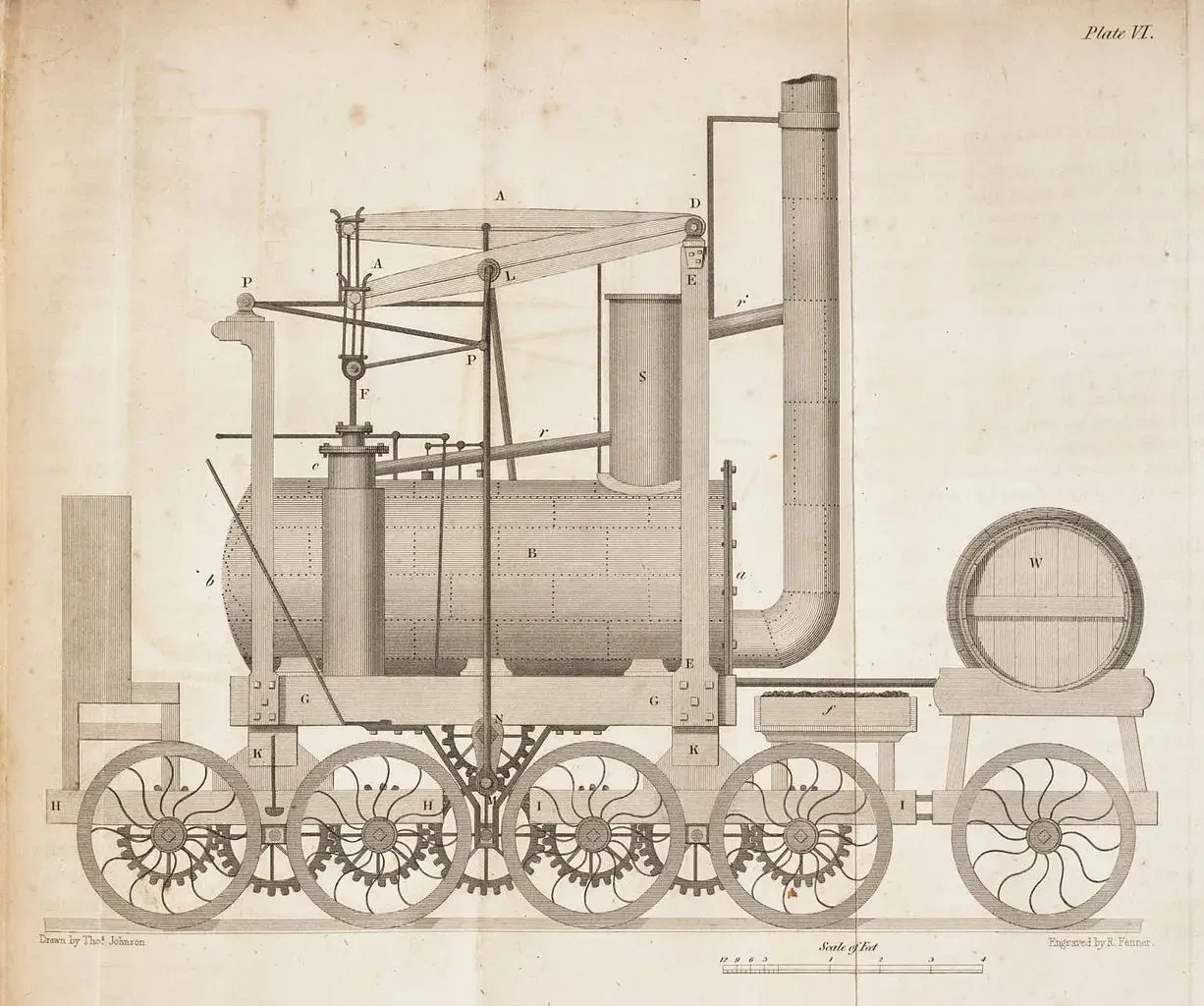 А было так, что Блэкет все в том же 1804 году узнал о работах Тревитика и дал задание воспроизвести его паровоз у себя в Нортумберленде. Сначала паровоз должен был двигаться по деревянным рельсам, ведущим от его шахты, но он сообразил, что они не выдержат веса пятитонного локомотива. Приспособили тянуть вагонетки тросами с помощью паровой машины, установленной стационарно. Наконец, он переделал дорогу под чугунные рельсы, а затем в 1808 году сделал Тревитику предложение попробовать еще раз. Но тот уже охладел к паровозостроению, занялся другими проектами и от предложения Блэкета отказался.