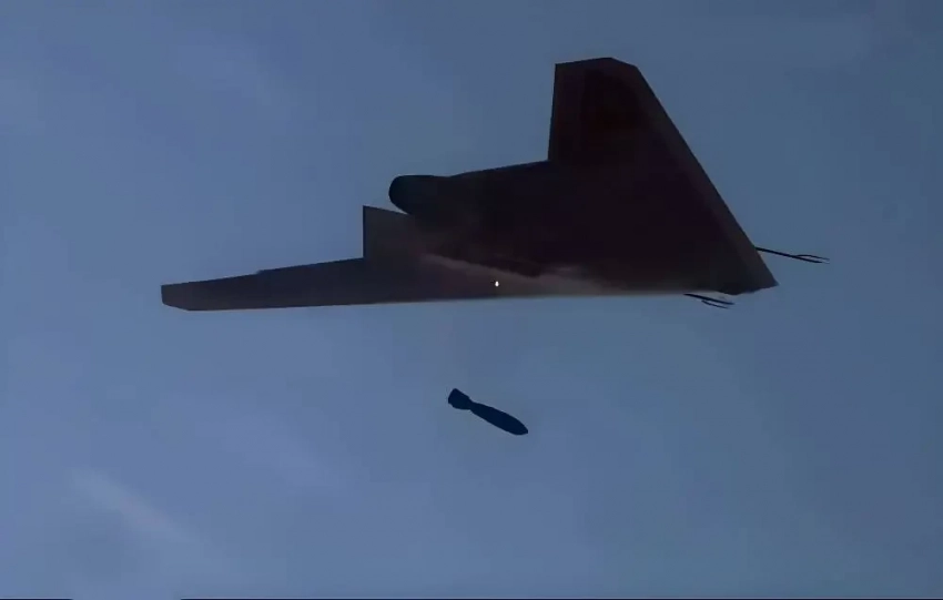 Сброс неуправляемой авиабомбы с БПЛА С-70 «Охотник» в ходе испытаний