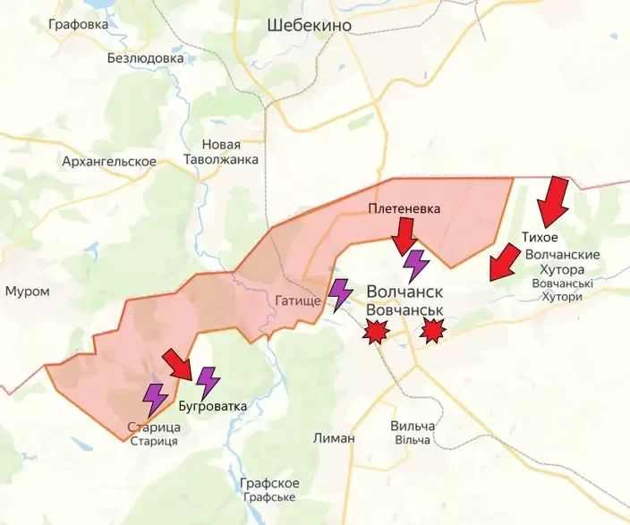 Российские войска, при поддержке авиации и артиллерии ведут наступательные действия в районе Липцов со стороны населенного пункта Глубокое. Ожесточённые бои продолжаются в районе Волчанска, где российские войска накануне освободили населенный пункт Гатище и продвинулись к окраинам населенного пункта Бугруватка. По позициям ВСУ в самом Волчанске активно работают средства дальнего поражения ВС РФ, пишет Wargonzo.