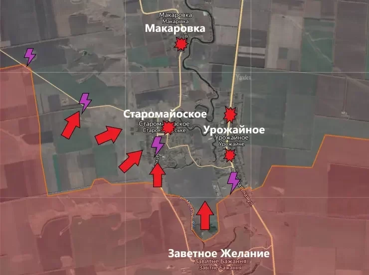 На Времьевском направлении продолжаются активные боестолкновения в Старомайорском и на южной окраине Урожайного. По позициям ВСУ на участке работает авиация и артиллерия ВС РФ.