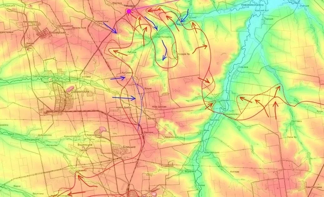 Единственный оставшийся маршрут, трасса М-30 в сторону Павлограда, находится под постоянным огневым контролем российских беспилотных аппаратов, что делает подвоз боеприпасов, топлива и подкреплений крайне затруднительным и малоэффективным.
