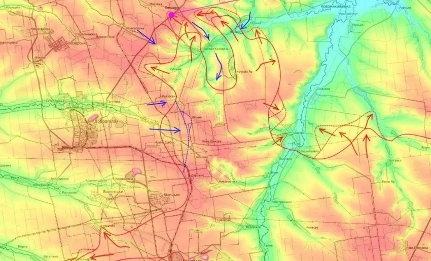 В свою очередь на Новопавловском направлении российская группировка войск "Восток" продолжает методичное продвижение. Основные наступательные действия развиваются с северо-запада от Великой Новосёлки в направлении Успеновки, Камышевахи и Великой Михайловки.
