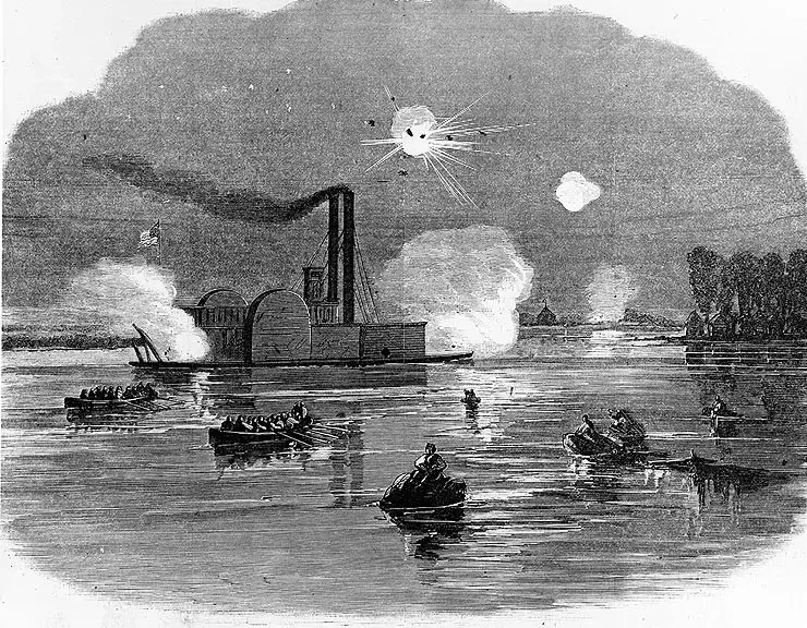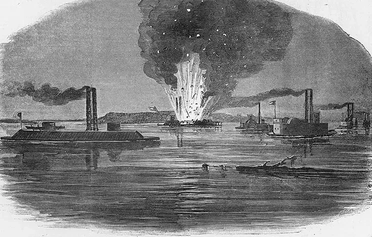 «Королева Запада» атакует канонерскую лодку мятежников «Город Виксбург» у Виксбурга, штат Миссисипи, 2 февраля 1863 года. В этом бою «Королева Запада» протаранила броненосец южан «Город Виксбург»и подожгла его снарядами, пропитанными скипидаром, выпущенными из носового орудия. Гравюра из журнала «Харперс Уикли», 1863 г.