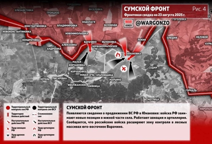 На Сумском направлении фиксируется продвижение ВС РФ в Юнаковке: войска РФ занимают новые позиции в южной части села. Работают авиация и артиллерия. Сообщается, что российские войска расширяют зону контроля в лесных массивах юго-восточнее Варачино.