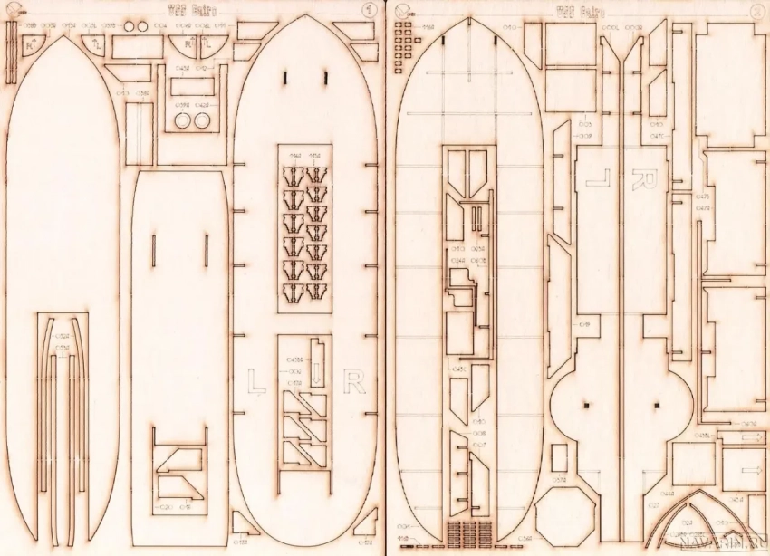 Таковыми, в принципе, были все бумажные модели прошлого века, разве что бумага на многих из них была довольно рыхлой. Зато сегодня такой бумаги в наборах уже нет. Мало того, появились производители, использующие современные технологии для изготовления дополнительных деталей бумажных моделей. Прежде всего, это комплекты лазерной резки. Обычно в этой технике делается «скелет судна» и его основные надстройки. Очень хорошо, что придумали еще и лазером не только вырезать детали моделей, но и гравировать палубы. Конечно, имея в руках бумажные палубы, вы всегда сможете наклеить на них «доски» из полосок шпона шириной 1,5–2 мм. Отдельные их неровности и шероховатости только лишь придадут вашей модели реализма, однако лазерная гравировка и очень красиво смотрится, и… экономит вам время на изготовление модели. Основной дополнительный материал для того же набора судна – шпангоуты и диаметральная плоскость – это картон: 0,5 мм, 1 мм и 1,5 мм. Добавляются к наборам сегодня и металлические детали «фототеч», полученные методом фототравления тонкого металла – обычно латуни.