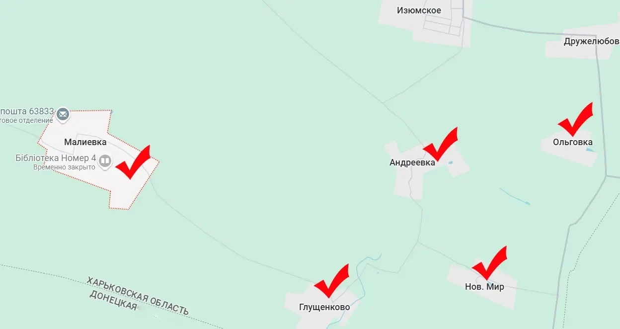 В сообщениях с фронта говорится, что российские войска взяли под контроль ряд населённых пунктов к юго-востоку от пгт Боровая. Это Новый Мир, Ольговка, Андреевка и Малиевка (не путать с Малиевкой Днепропетровской области, хотя и та тоже под контролем ВС РФ). Ранее было освобождено Глущенково.