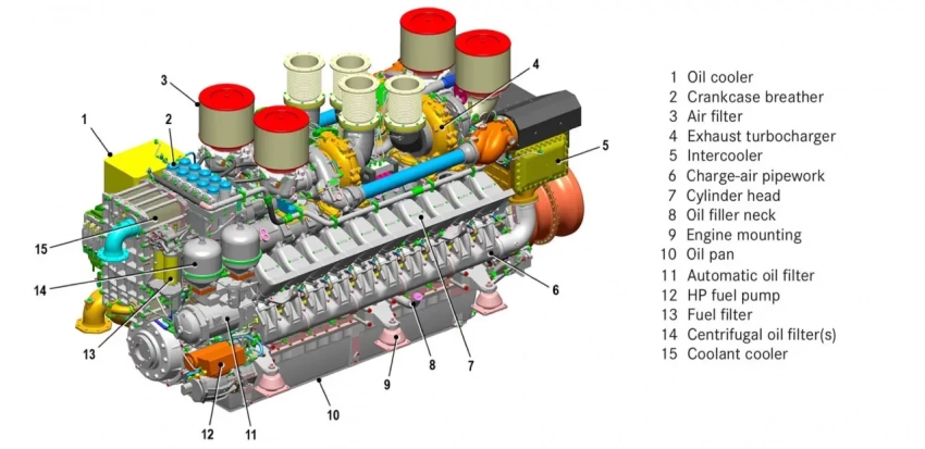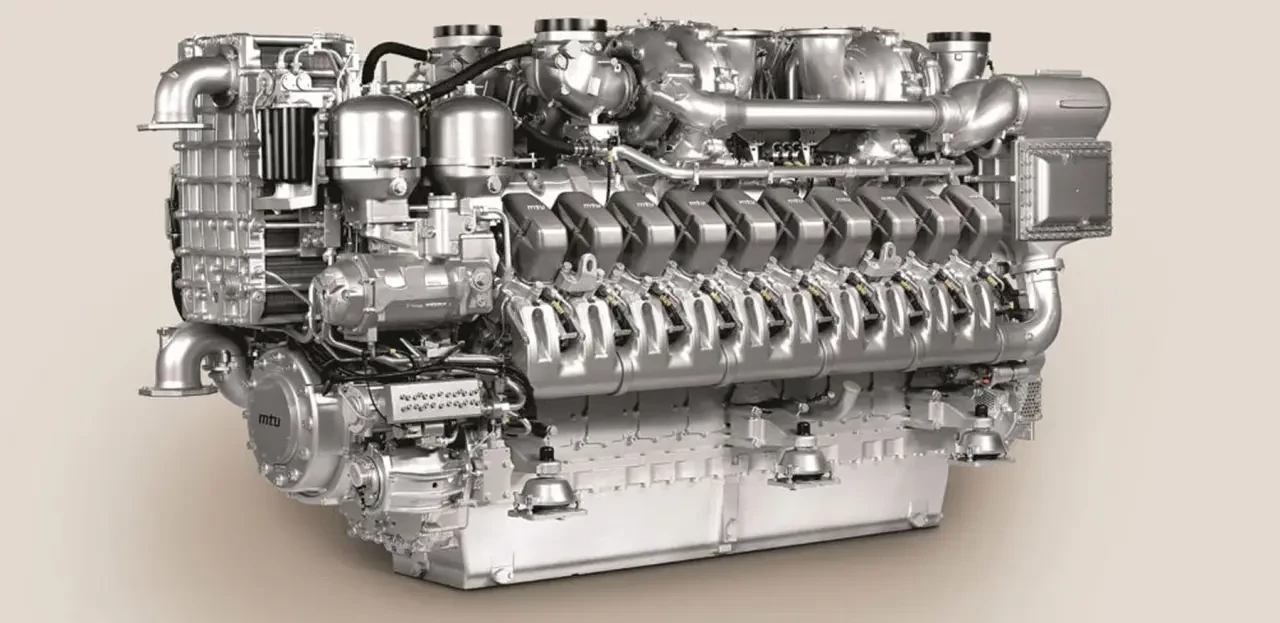 Такой же двигатель, но в 12-цилиндровом исполнении, сейчас устанавливаются на фрегатах Т23 при модернизации, поэтому к моменту, когда Т26 войдут в строй, судовые механики получат достаточный опыт. На сайте MTU пишут, что двигатель имеет топливную систему common rail, номинальная мощность 3015 кВт при 1800 оборотах, диаметр цилиндра 170 мм, ход поршня 210 мм, расход топлива на номинальной мощности 580 л/час, вес в сборе с генератором 18 тонн. Буква V в маркировке означает, что он V-образный.