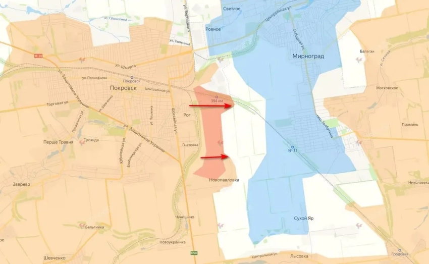 Покровск (Красноармейск). Российские войска продолжают зачищать восточную окраину города. Занята железнодорожная станция «394 км», закрыт карман между Гнатовкой и Новопавловкой.