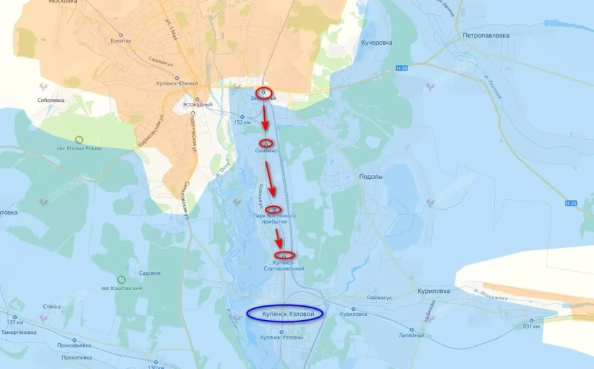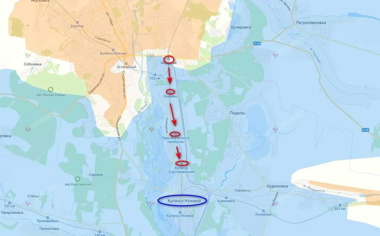 Красными кружочками отмечены железнодорожные станции, которые еще вчера перешли под наш контроль. Сейчас наши идут к Купянску-Узловому, чтобы поставить окончательный крест на попытках противника переправиться.