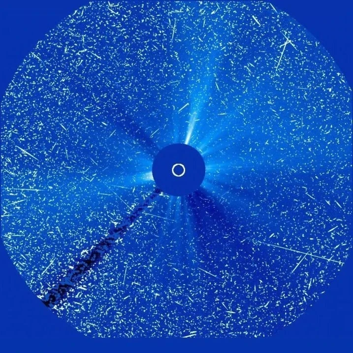 Аппарат SOHO, находящийся далеко за пределами защитного поля магнитосферы Земли, фактически «ослеп». Его детекторы и телескопы буквально засыпаны следами от ударяющих по ним частиц, и разобрать изображение на снимках можно лишь с большим трудом.