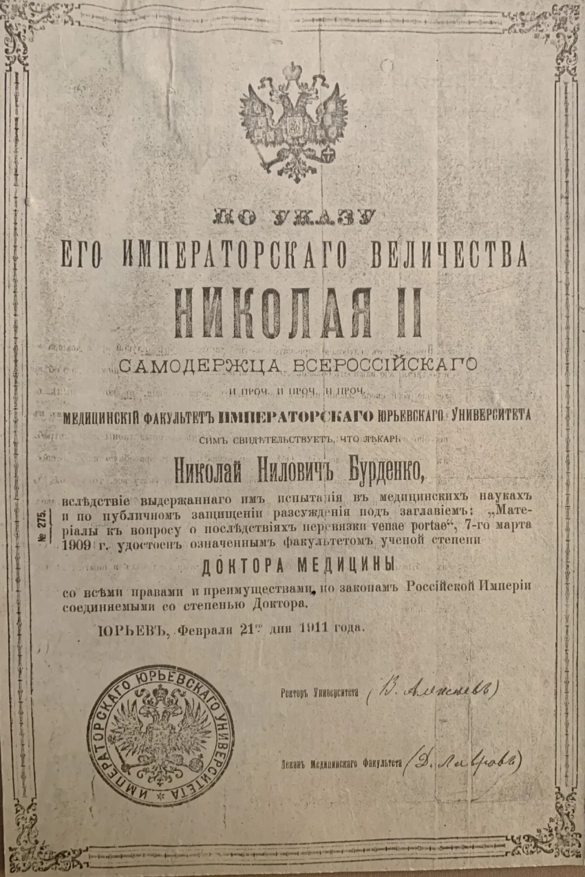 А дальше было так, что хотя некую бумагу на фотографии Николай и подписал, но… участие в забастовке студентов в 1899 г. все-таки принял и был исключен из университета. Однако подал прошение о восстановлении и снова вернулся в университет. В 1901 году его имя снова появилось в списке забастовщиков, по некоторым сведениям, попало оно туда случайно. Однако Бурденко был все же вынужден покинуть Томск и 11 октября 1901 года перевестись… в Юрьевский университет (ныне университет в городе Тарту, Эстония) на четвёртый курс медицинского факультета. Там, видимо, было «посвободнее». Но отметим и тот факт, что не так уж и сильно царизм преследовал молодых бунтовщиков. Возможность учиться для них он не закрывал…