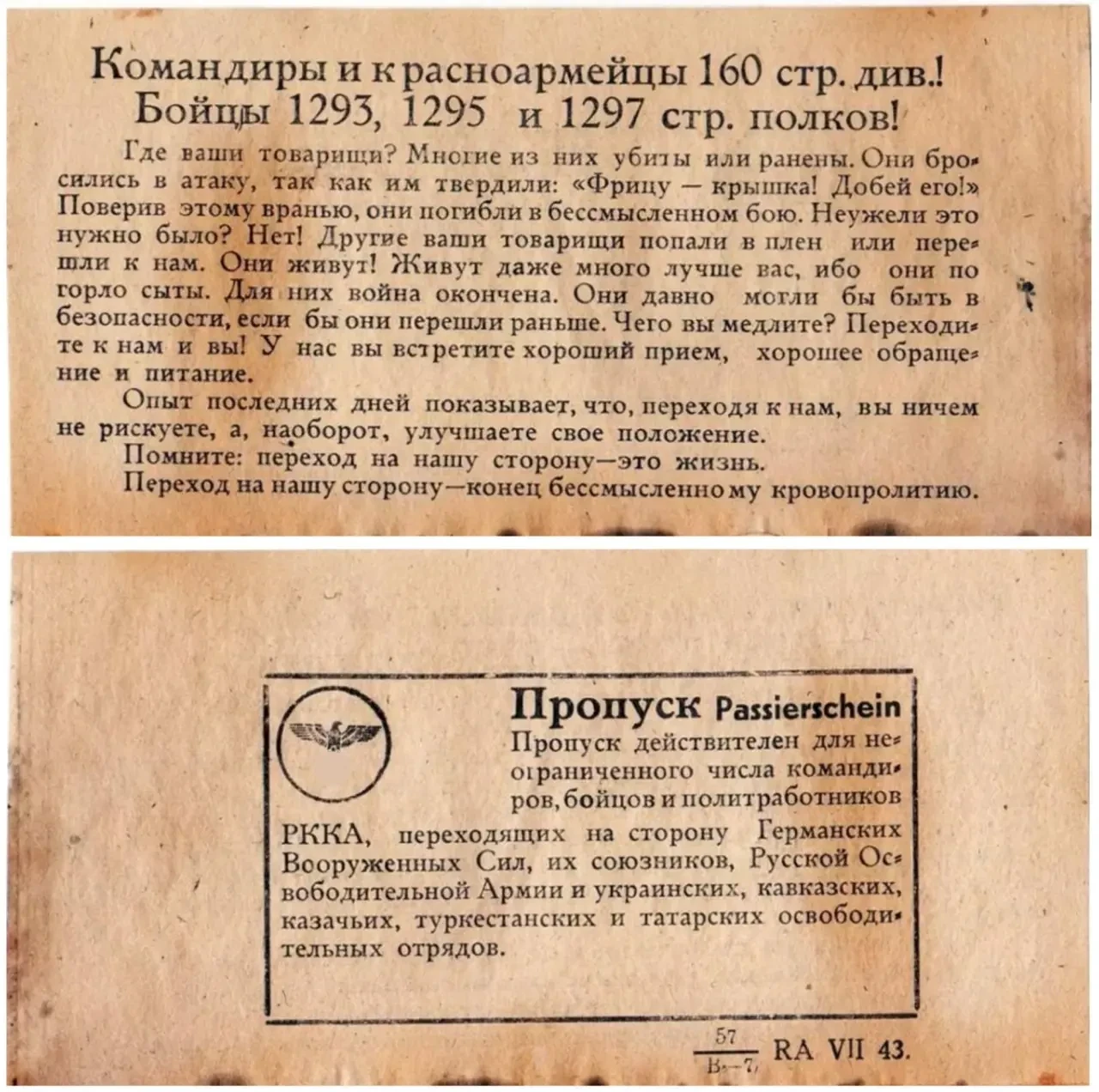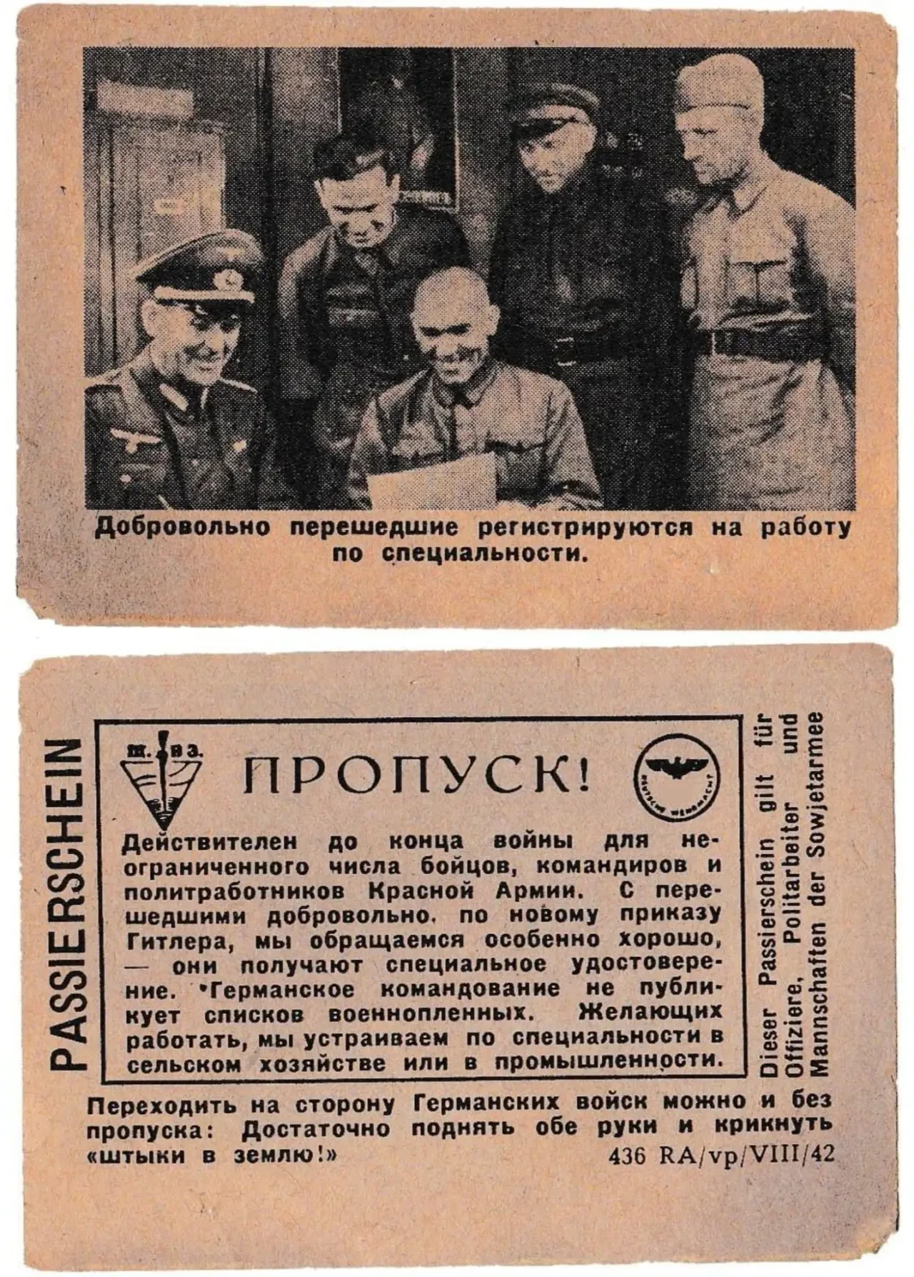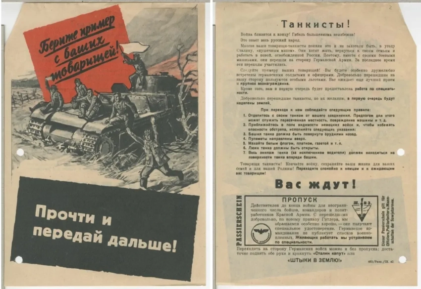 Одной из главных задач почти всех немецких листовок было побудить советских бойцов переходить в плен. На большинстве листовок было изображение пропуска с уточнением, что он действует для неограниченного числа солдат и офицеров (в начале войны по одному пропуску могли перейти до 50 человек). На пропусках была надпись, которую надо было выкрикнуть для обозначения своего намерения перехода к немцам («Штыки в землю!», «Сталин капут!» и другие).