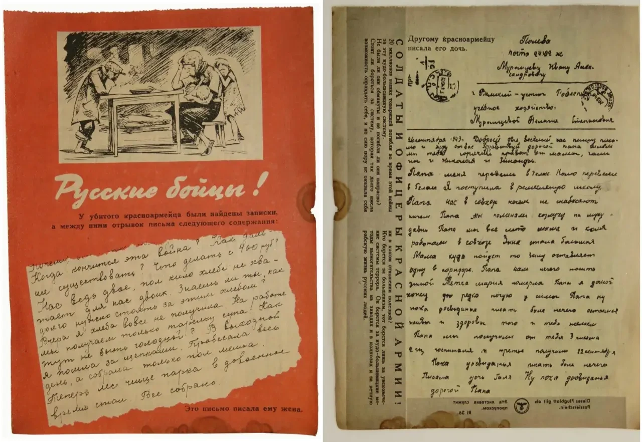 Листовка с факсимильным изображением писем от жены и дочери красноармейца. Письма, вероятно, были написаны пропагандистами вермахта