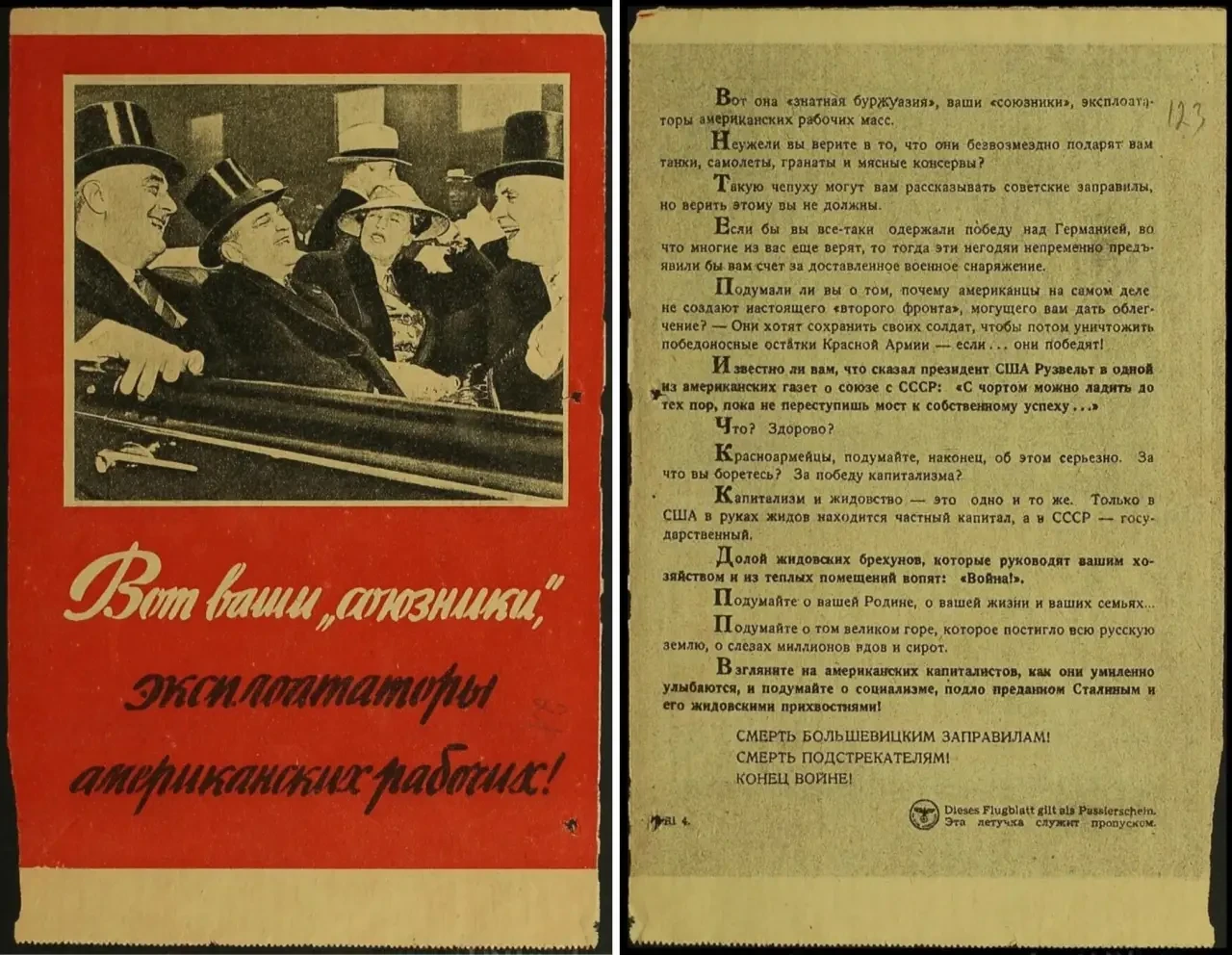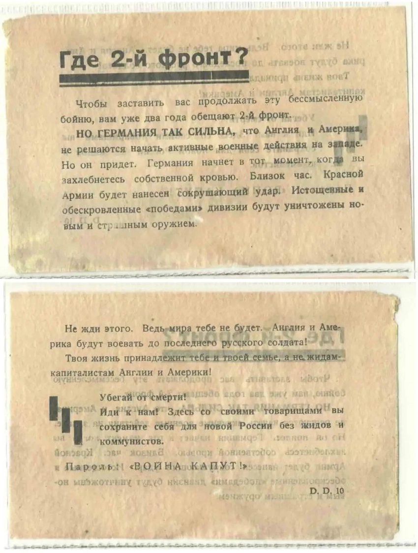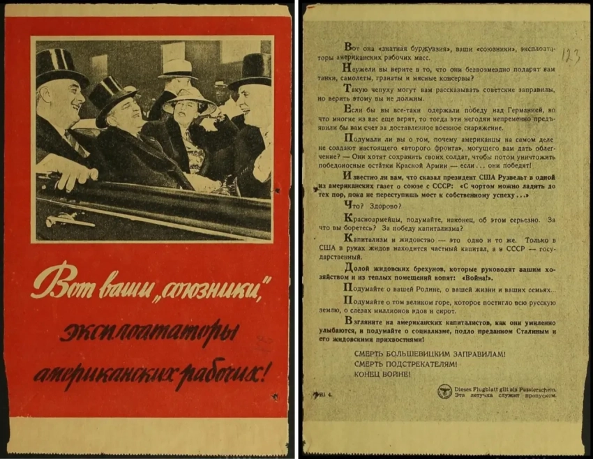 Также в листовках писалось, что капиталистические Англия и Америка на самом деле являются врагами СССР и не собираются помогать Красной Армии в борьбе с фашизмом. Помимо этого, часто указывалось, что руководство Советского Союза находится в сговоре с капиталистами и отдает им народные богатства народов СССР, а немецкая армия несёт освобождение и хочет положить этому конец.