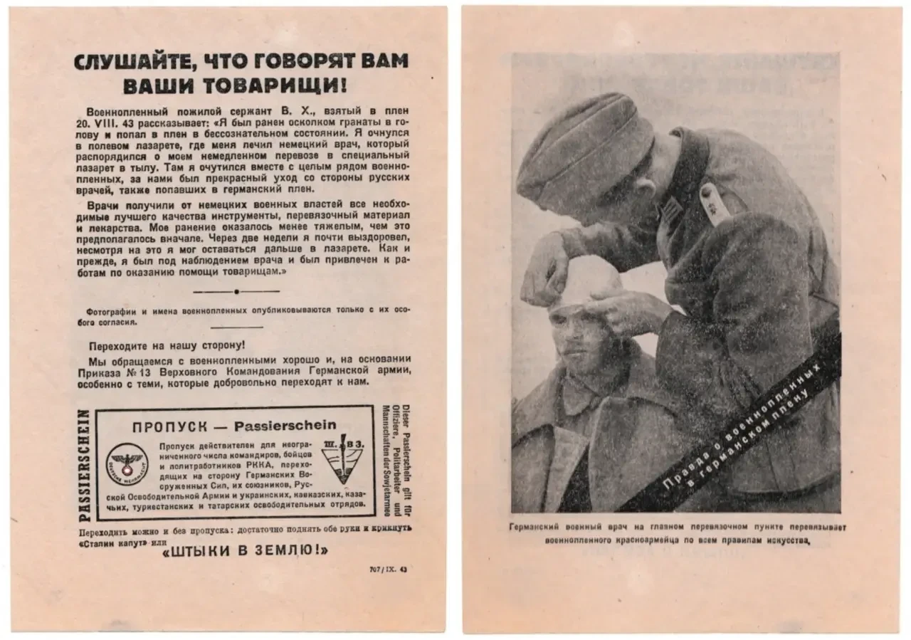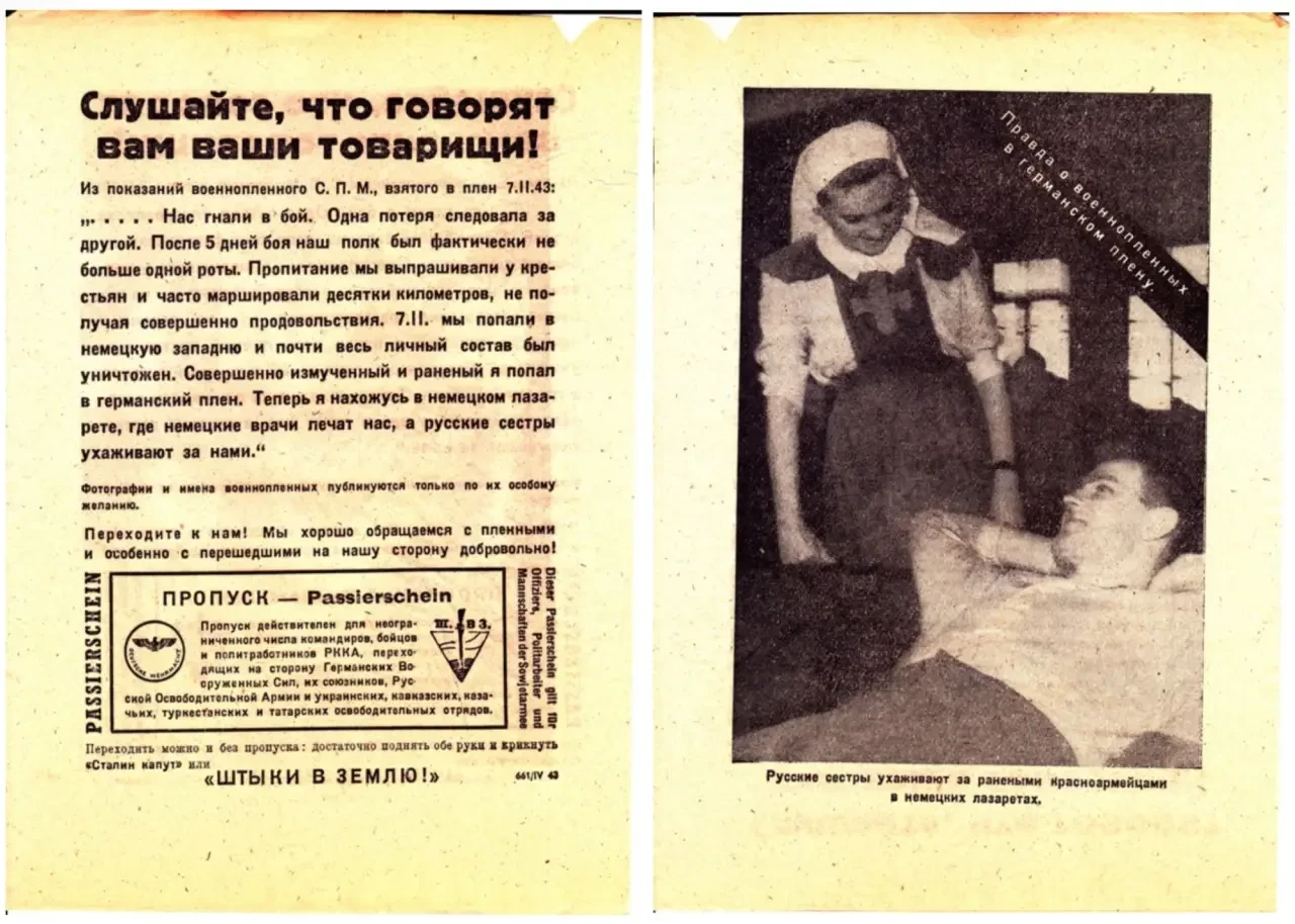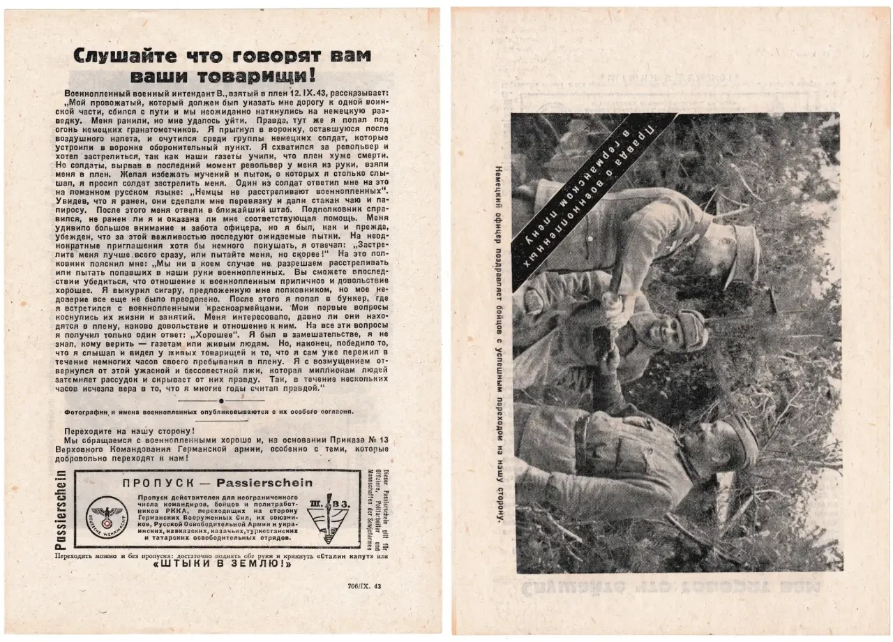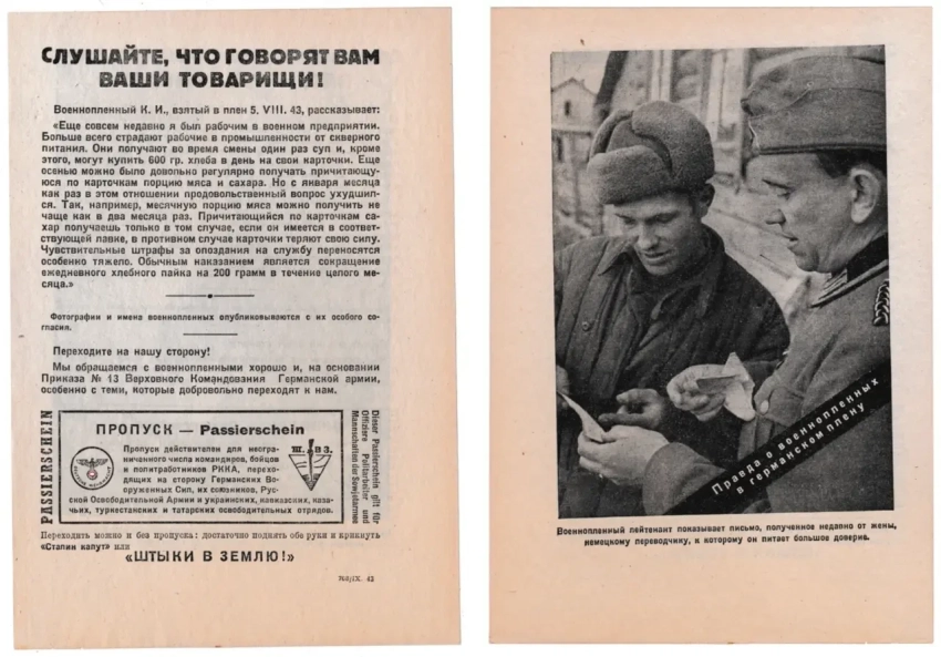 Наиболее узнаваемыми из подобных пропагандистских материалов являются листовки «Слушайте, что говорят ваши товарищи!». В них печаталась фотография военнопленного и от его имени рассказывалось о том, как хорошо немцы с ним обращаются, и о том, что все слова советской пропаганды о немцах — ложь.
