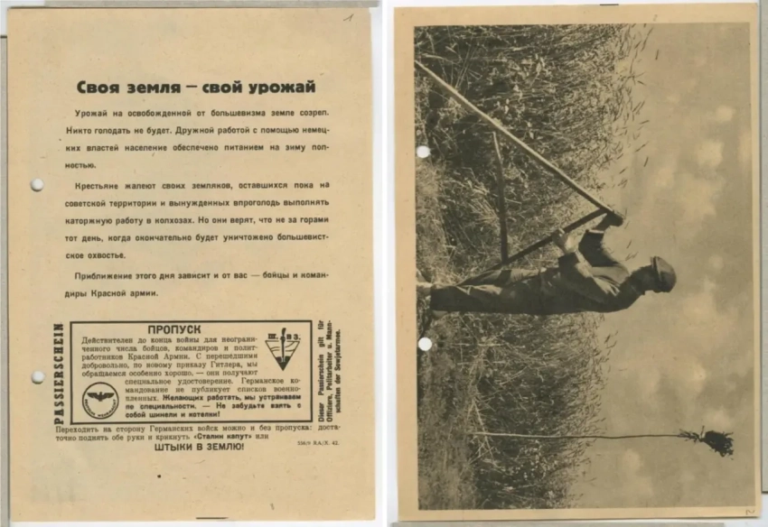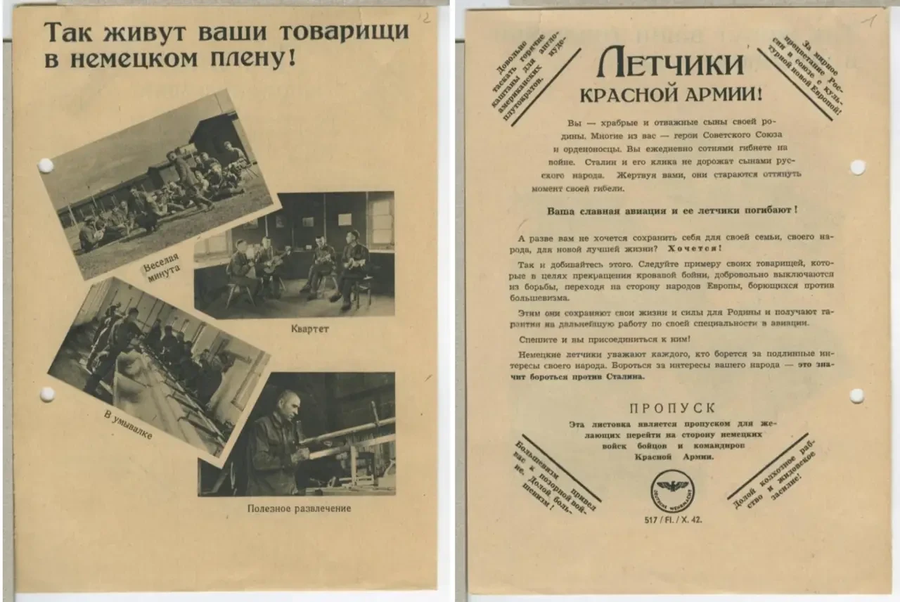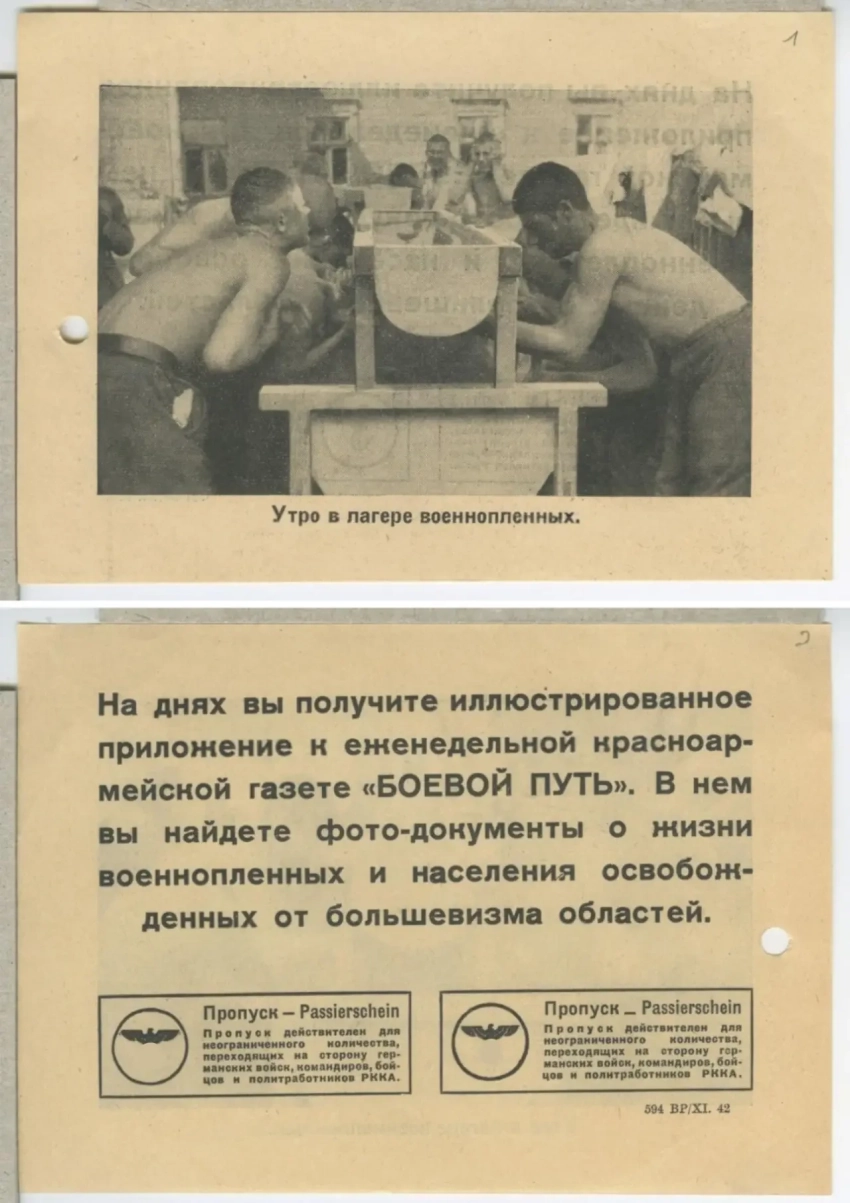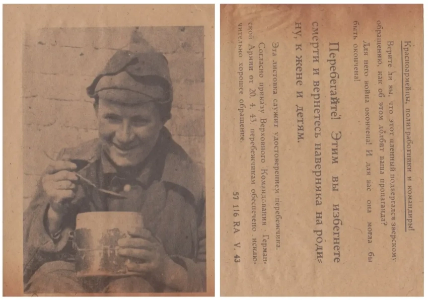 Фашисты понимали, что для того, чтобы советские солдаты начали сдаваться в плен, необходимо пообещать им то, в чём они в первую очередь нуждались. В первую очередь это уход от войны, вкусную еду и тёплое жильё. Для этих целей было создано огромное количество листовок, показывающих хорошую жизнь в немецком плену. На большинство подобных листовок помещались фотографии советских бойцов, якобы уже перешедших в плен. На фотографиях изображалось, как солдаты едят вкусную еду, работают по специальности, отдыхают, играют в карты, участвуют в праздничных мероприятиях в лагерях и прочее.