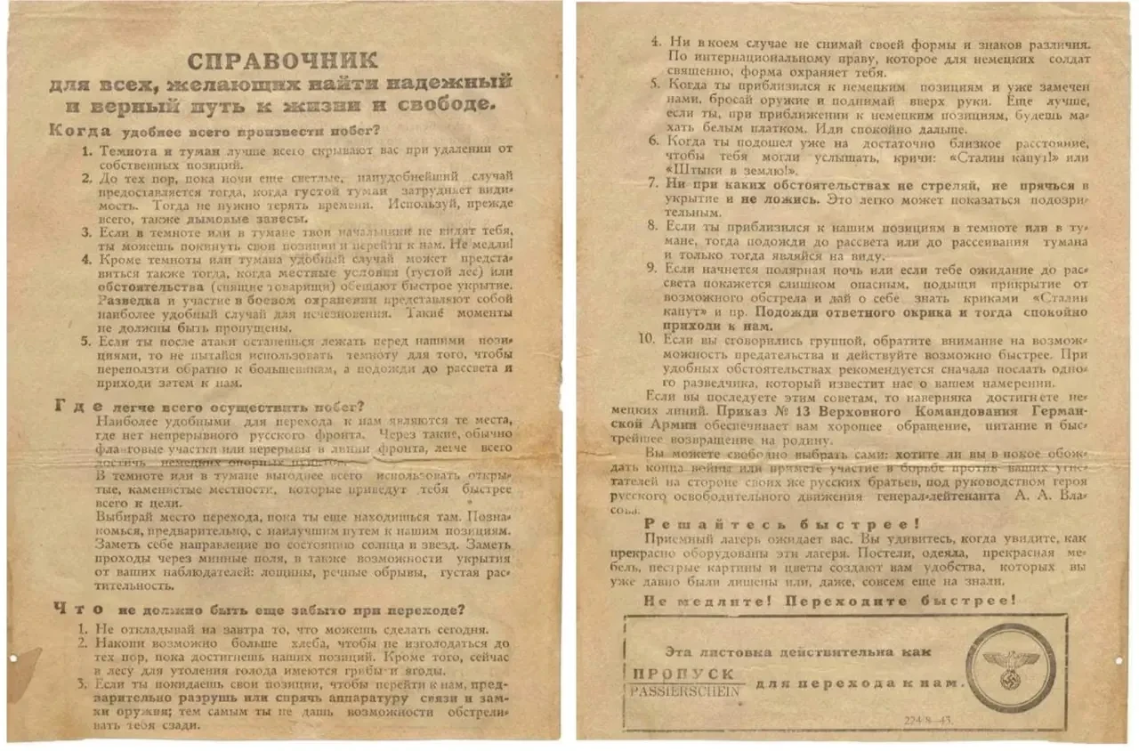 В данном виде листовок также особенно важно было дать практические рекомендации и порядок действий по пунктам для солдат Красной Армии (своего рода «дорожная карта»). В листовках должно было быть указано, как именно отделиться от своего отряда, как лучше пересечь фронтовую полосу, как правильно и безопасно перейти на сторону немцев и как при этом себя вести.