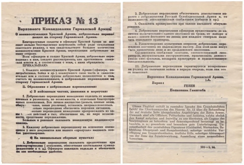 Главным из подобных документов являлся Приказ №13 Верховного командования Германской армии «О военнослужащих Красной Армии, добровольно перешедших на сторону Германской армии». Приказ был создан для стимуляции перехода к немцам и искоренения страха советских солдат перед немецким пленом, а также обещал ряд льгот при пребывании в немецком плену и установления статуса «добровольно перешедший» вместо режущего слух «военнопленный».
