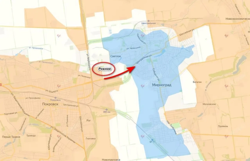 О боях за Ровное, а также зачистке этого населенного пункта сегодня сообщало Минобороны, но о продвижении вглубь Мирнограда с этой стороны информации не было. По данным военного ведомства, за сутки боев здесь в плен сдались трое украинских военных, самостоятельно вышедших к нашим позициям с поднятыми руками. И вот теперь приходит информация, что прорыв все же случился, наши снесли опорники ВСУ и со стороны Ровное вошли в Мирноград.