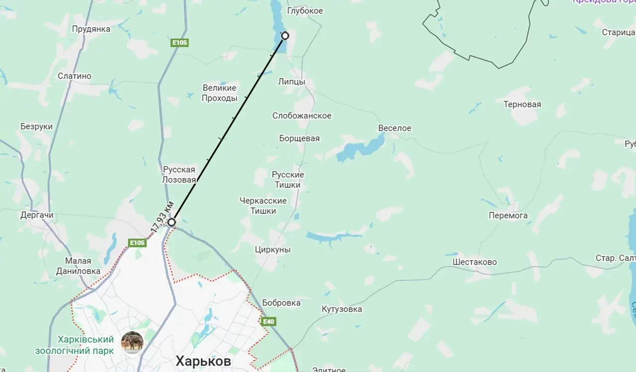 Кратчайшее расстояние до Харькова оценивается примерно в 17,9 км. Это расстояние от передовых позиций российской армии южнее ранее освобождённого села Глубокое к северу от областного центра.