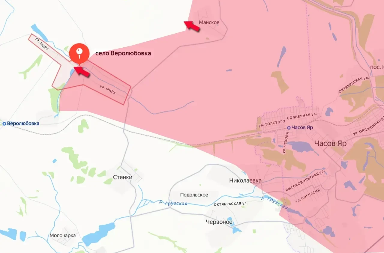 На этом же направлении Вооружённые силы России вошли и в другое село – Веролюбовку. Она расположена чуть более чем в 3 км от Майского. Юго-восточная и центральная части Веролюбовки уже перешли под контроль армии России.