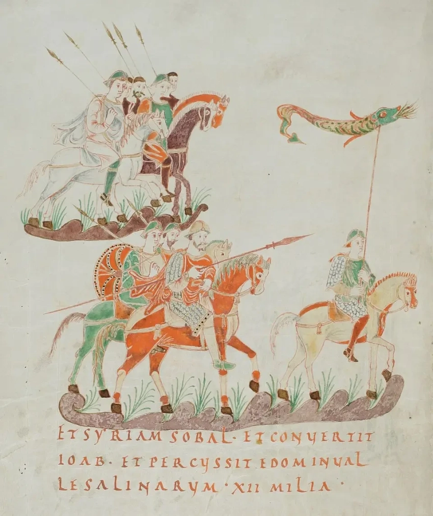 Иллюстрация к псалму 59 (60), изображающая Иоава в качестве предводителя воинов, одетых в стиле франкской кавалерии эпохи Каролингов. «Золотая псалтирь» из монастыря Сент-Галлена (Святого Галла)