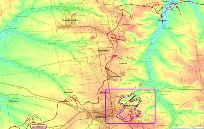 Параллельно идут ожесточённые бои за Новоподгороднее и Гришино. В последнем российские десантники освободили южную часть села и ведут бои в центре, что угрожает последним маршрутам снабжения ВСУ в Мирнограде.