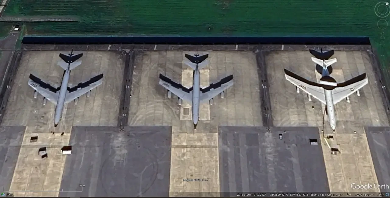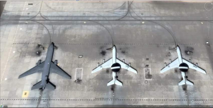 Спутниковый снимок Google Earth: разведывательный Boeing RC-135S Cobra Ball, самолёт ДРЛО Boeing E-3G Sentry и заправщик Boeing KC-135R на авиабазе Кадена