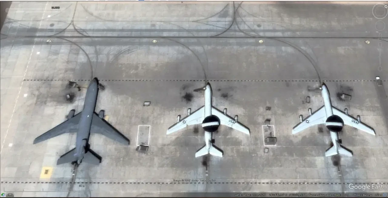Спутниковый снимок Google Earth: самолёт ДРЛО Boeing E-3G Sentry и самолёты-заправщики Boeing KC-135 на авиабазе Милденхолл в Великобритании. Снимок сделан в июне 2022 года