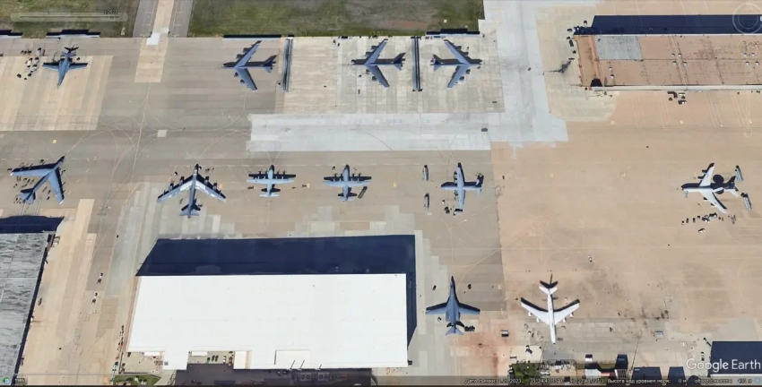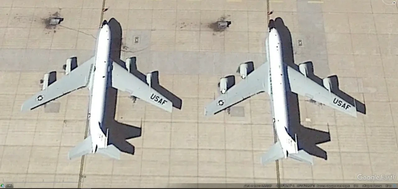 Спутниковый снимок Google Earth: самолёты RC-135U Combat Sent и Boeing RC-135W Rivet Joint на авиабазе Оффут